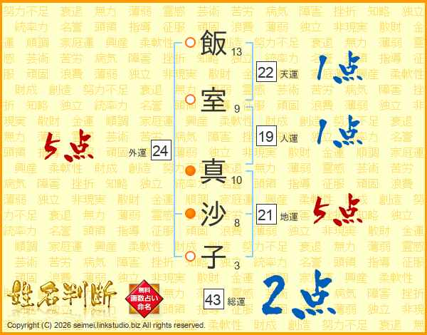 飯(13画)室(9画) 真(10画)沙(8画)子(3画)