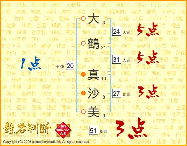 大(3画)鶴(21画) 真(10画)沙(8画)美(9画)