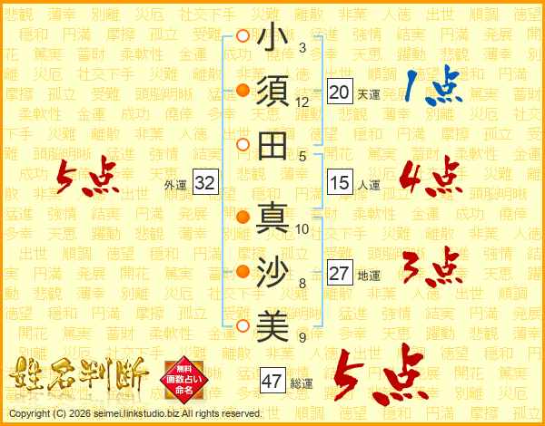 小(3画)須(12画)田(5画) 真(10画)沙(8画)美(9画)