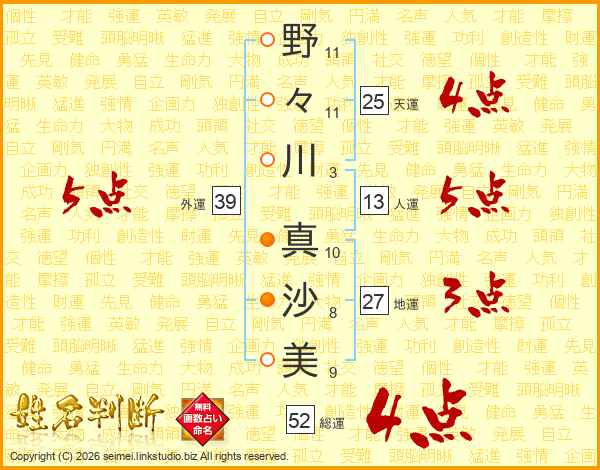 野(11画)々(11画)川(3画) 真(10画)沙(8画)美(9画)