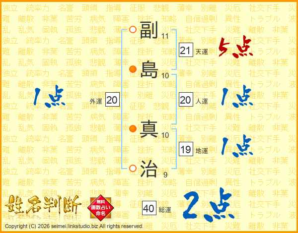 生活面を象徴する運勢です。外部から受ける影響力を表し、結婚運、家庭運や職場、環境への順応性を表します。総運から人運を引いた画数。姓や名が1文字の場合を除く。