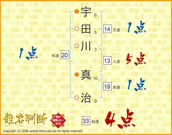 宇(6画)田(5画)川(3画) 真(10画)治(9画)