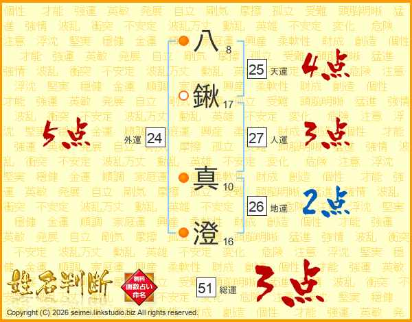 八(8画)鍬(17画) 真(10画)澄(16画)