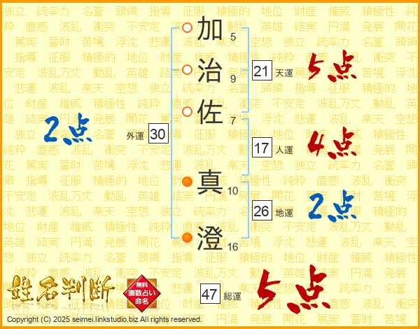 加(5画)治(9画)佐(7画) 真(10画)澄(16画)