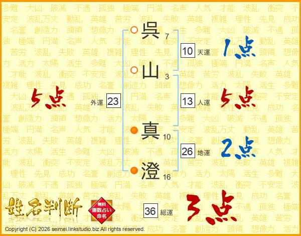 呉(7画)山(3画) 真(10画)澄(16画)
