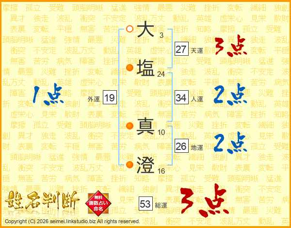 あなたの人生を表す1番重要な運勢です。生涯を通じて影響する総合運となり、主に50歳以降の晩年期に影響を及ぼします。苗字と名前の合計画数。