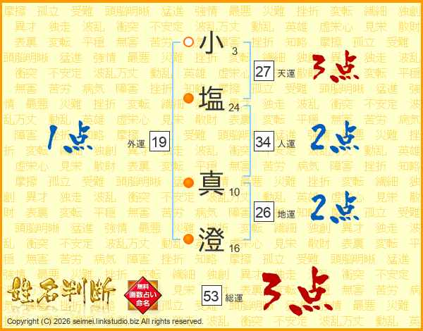 小(3画)塩(24画) 真(10画)澄(16画)
