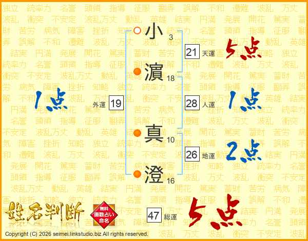あなたの人生を表す1番重要な運勢です。生涯を通じて影響する総合運となり、主に50歳以降の晩年期に影響を及ぼします。苗字と名前の合計画数。