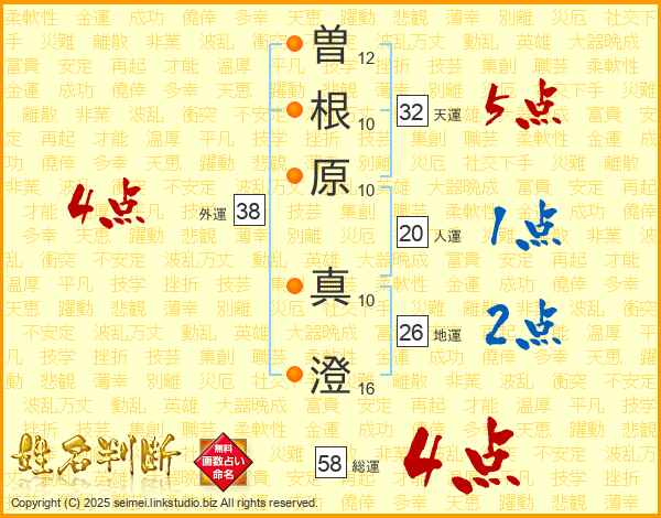 曽(12画)根(10画)原(10画) 真(10画)澄(16画)