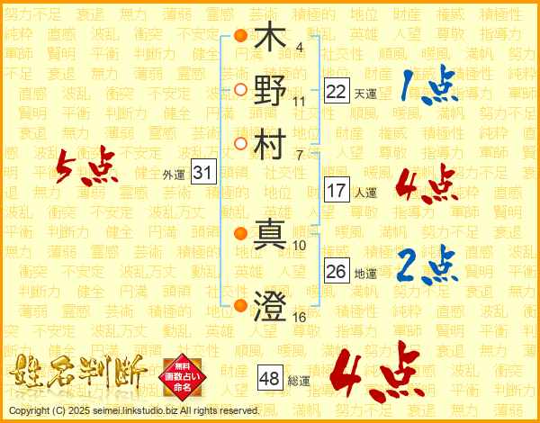 木(4画)野(11画)村(7画) 真(10画)澄(16画)