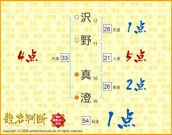 生活面を象徴する運勢です。外部から受ける影響力を表し、結婚運、家庭運や職場、環境への順応性を表します。総運から人運を引いた画数。姓や名が1文字の場合を除く。