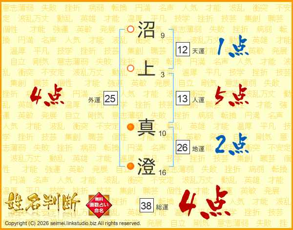 沼(9画)上(3画) 真(10画)澄(16画)