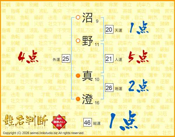 沼(9画)野(11画) 真(10画)澄(16画)