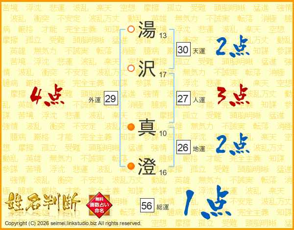 湯(13画)沢(17画) 真(10画)澄(16画)