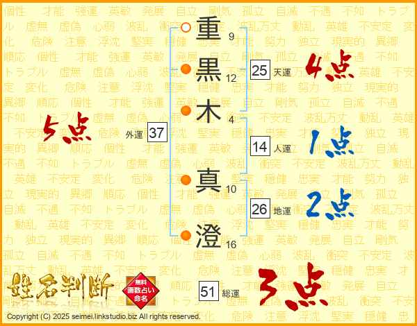 重(9画)黒(12画)木(4画)  真(10画)澄(16画)