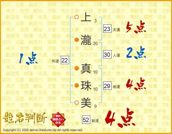 上(3画)瀧(20画) 真(10画)珠(10画)美(9画)