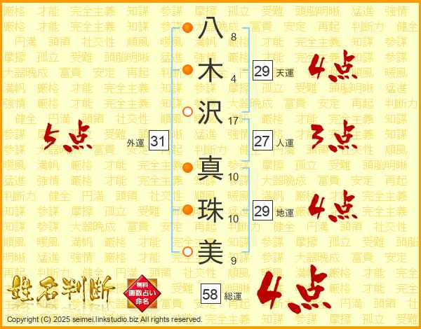 八(8画)木(4画)沢(17画) 真(10画)珠(10画)美(9画)
