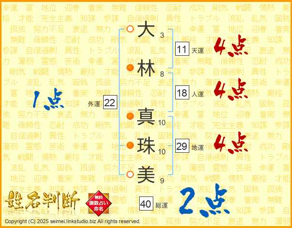 大(3画)林(8画) 真(10画)珠(10画)美(9画)
