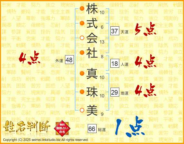 株(10画)式(6画)会(13画)社(8画) 真(10画)珠(10画)美(9画)