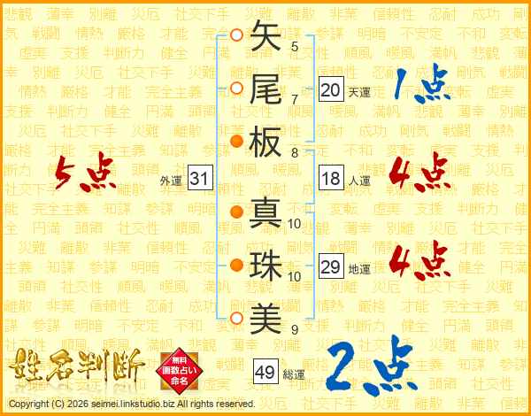 矢(5画)尾(7画)板(8画) 真(10画)珠(10画)美(9画)