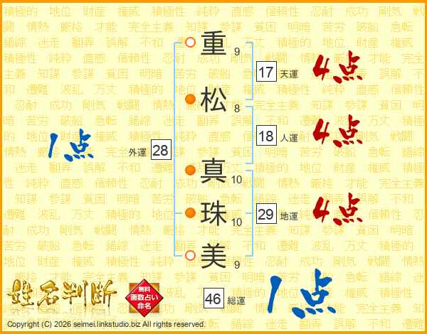重(9画)松(8画) 真(10画)珠(10画)美(9画)