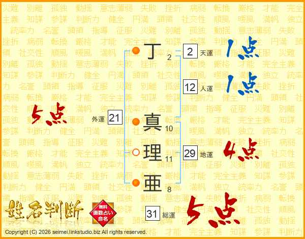 丁真理亜さんの総運は31画の5点!
