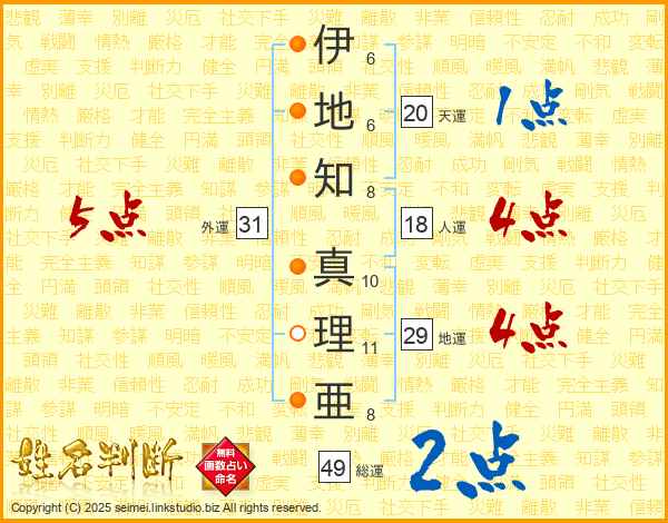 伊(6画)地(6画)知(8画) 真(10画)理(11画)亜(8画)