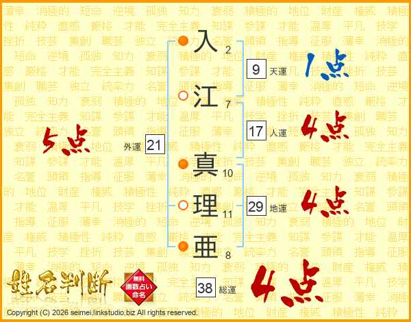 入江真理亜さんの総運は38画の4点!