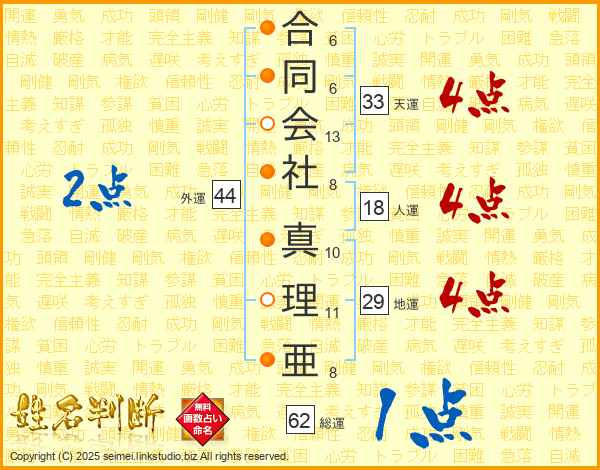 合(6画)同(6画)会(13画)社(8画) 真(10画)理(11画)亜(8画)
