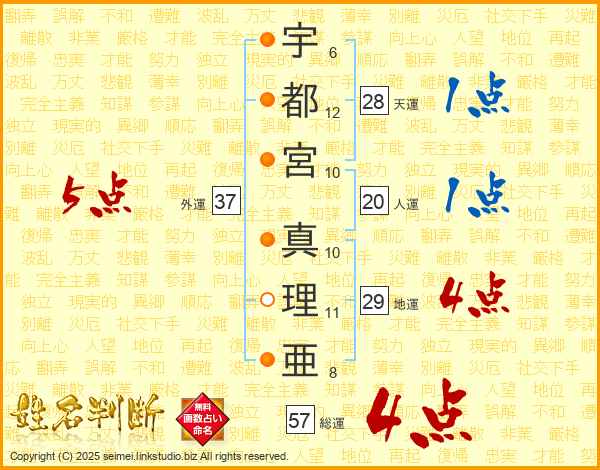 宇都宮真理亜さんの総運は57画の4点!