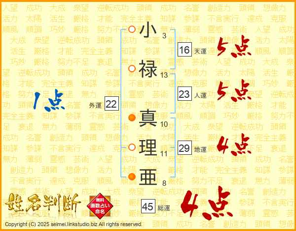 小(3画)禄(13画) 真(10画)理(11画)亜(8画)