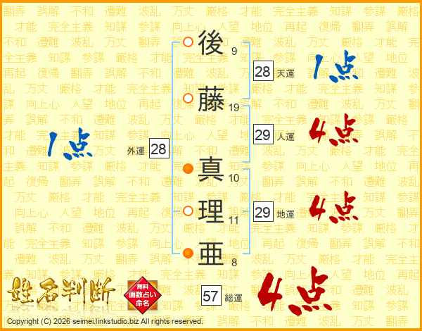 後(9画)藤(19画) 真(10画)理(11画)亜(8画)