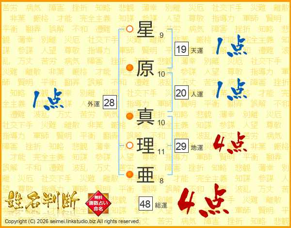 星(9画)原(10画) 真(10画)理(11画)亜(8画)