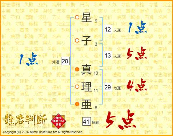 星(9画)子(3画) 真(10画)理(11画)亜(8画)