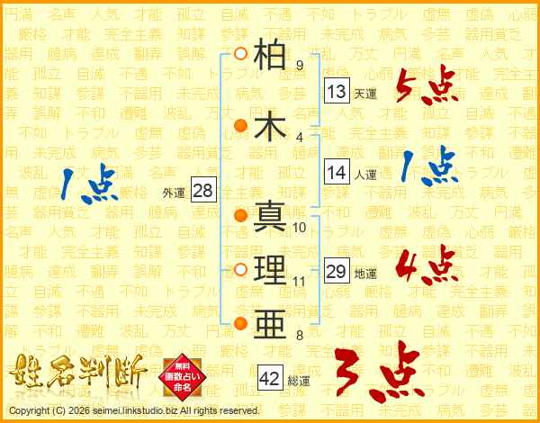 柏(9画)木(4画) 真(10画)理(11画)亜(8画)