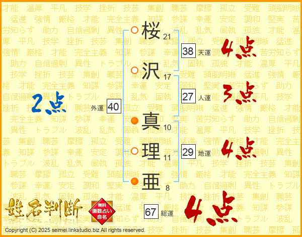 桜(21画)沢(17画) 真(10画)理(11画)亜(8画)