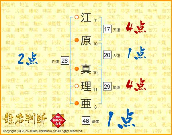 江(7画)原(10画) 真(10画)理(11画)亜(8画)