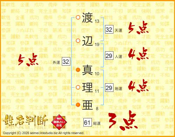 渡(13画)辺(19画) 真(10画)理(11画)亜(8画)