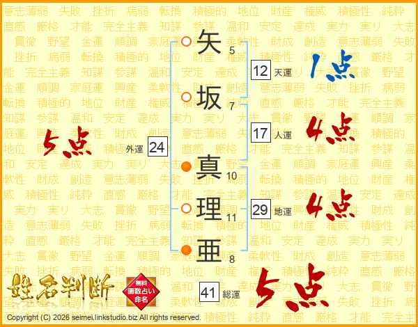 矢(5画)坂(7画) 真(10画)理(11画)亜(8画)