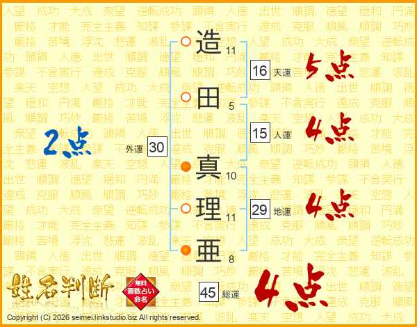 造(11画)田(5画) 真(10画)理(11画)亜(8画)