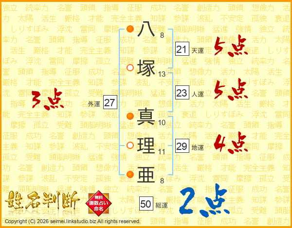八(8画)塚(13画) 真(10画)理(11画)亜(8画)