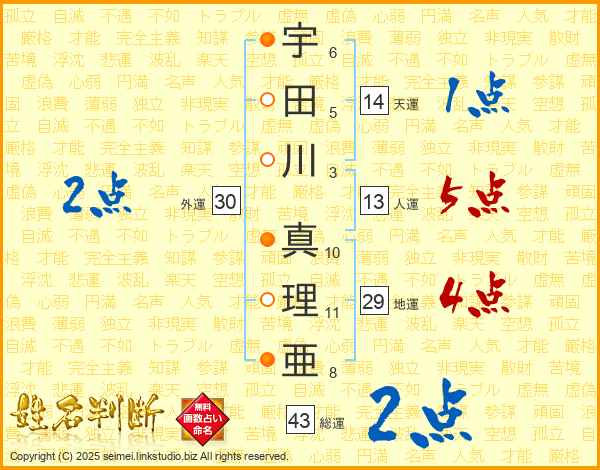 生活面を象徴する運勢です。外部から受ける影響力を表し、結婚運、家庭運や職場、環境への順応性を表します。総運から人運を引いた画数。姓や名が1文字の場合を除く。