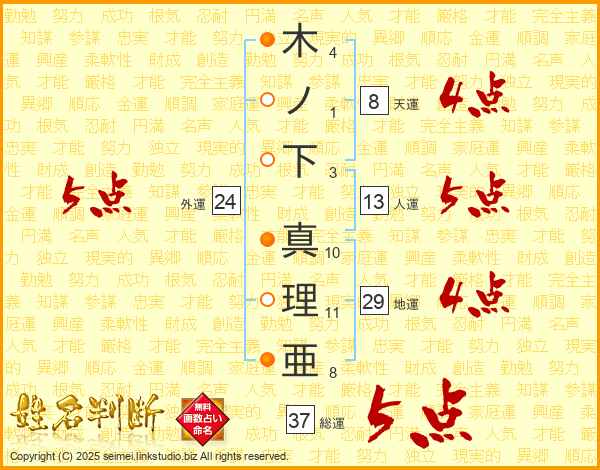 木(4画)ノ(1画)下(3画) 真(10画)理(11画)亜(8画)