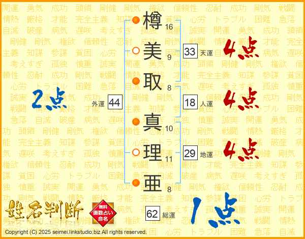 樽(16画)美(9画)取(8画) 真(10画)理(11画)亜(8画)