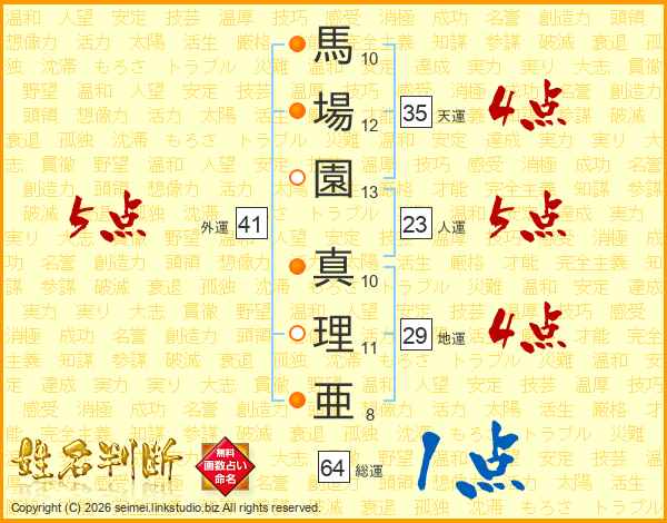 馬(10画)場(12画)園(13画) 真(10画)理(11画)亜(8画)