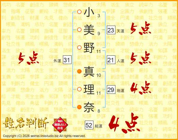 小(3画)美(9画)野(11画) 真(10画)理(11画)奈(8画)