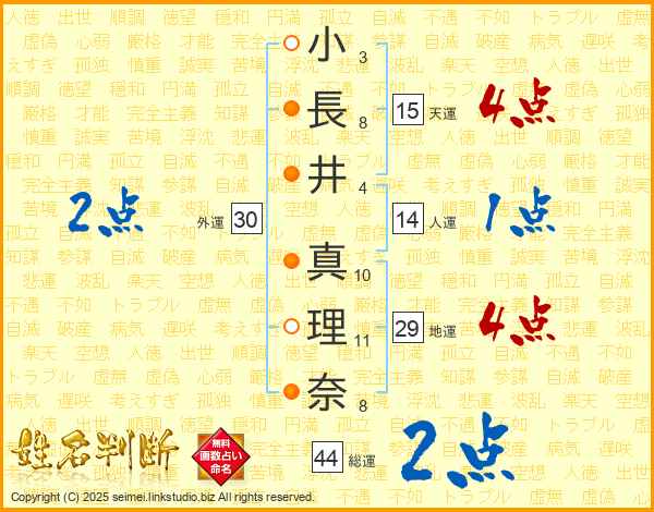 小(3画)長(8画)井(4画) 真(10画)理(11画)奈(8画)