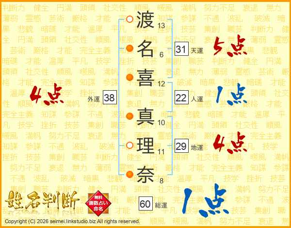 渡(13画)名(6画)喜(12画) 真(10画)理(11画)奈(8画)