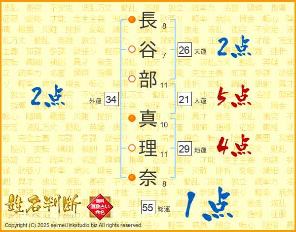 長(8画)谷(7画)部(11画) 真(10画)理(11画)奈(8画)