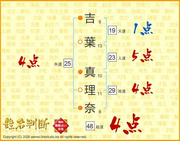 吉(6画)葉(13画) 真(10画)理(11画)奈(8画)